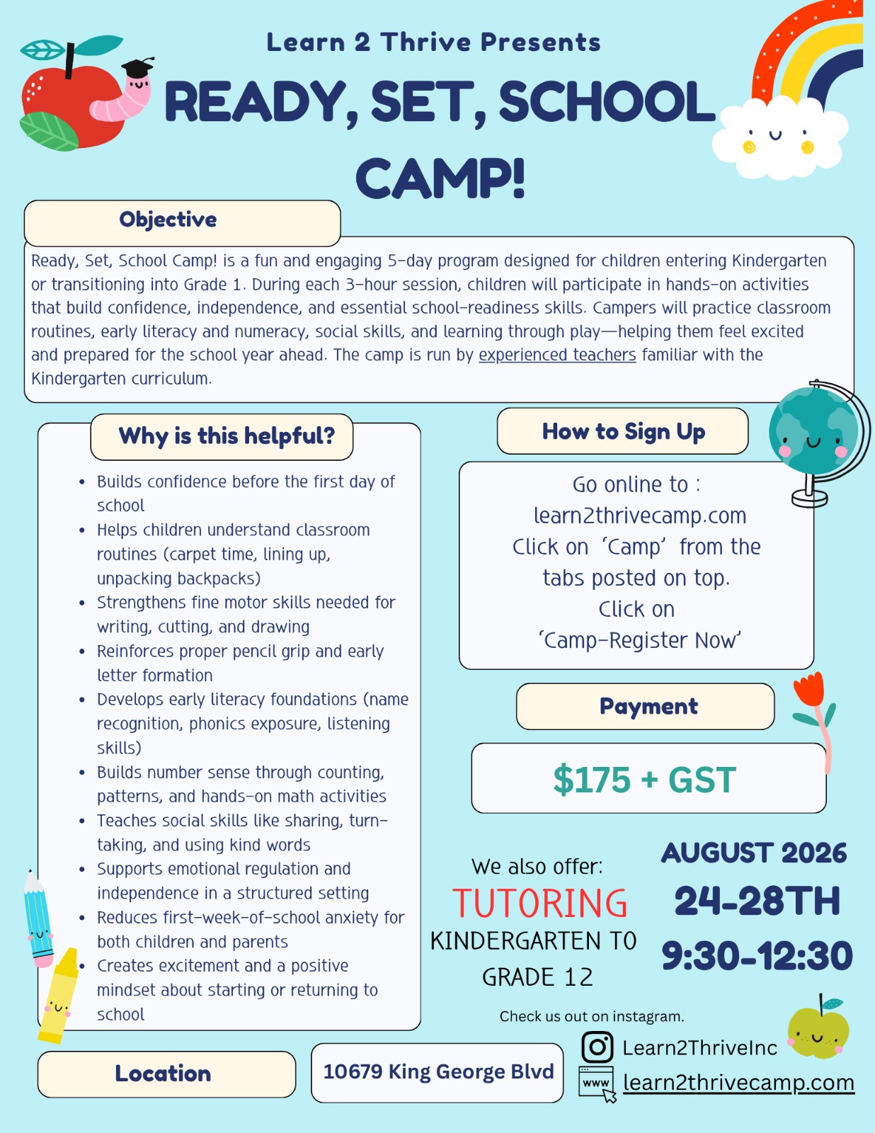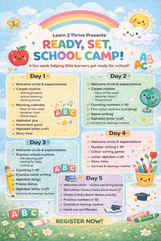 To ensure a safe, comfortable, and efficient camp environment, all children attending the Learn 2 Thrive Camp must be fully potty trained and able to use the washroom independently.